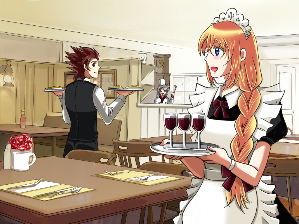 ウエイターなロイド&ウエイトレスなコレット (厨房奥にコック姿のジーニアス) ロイド君が正面見えてないのが悔やまれるけど、働いてるってことで一つ! 背景は写真トレス&改変です(バラす人) リクエストTOPへ >> サイトTOPへ