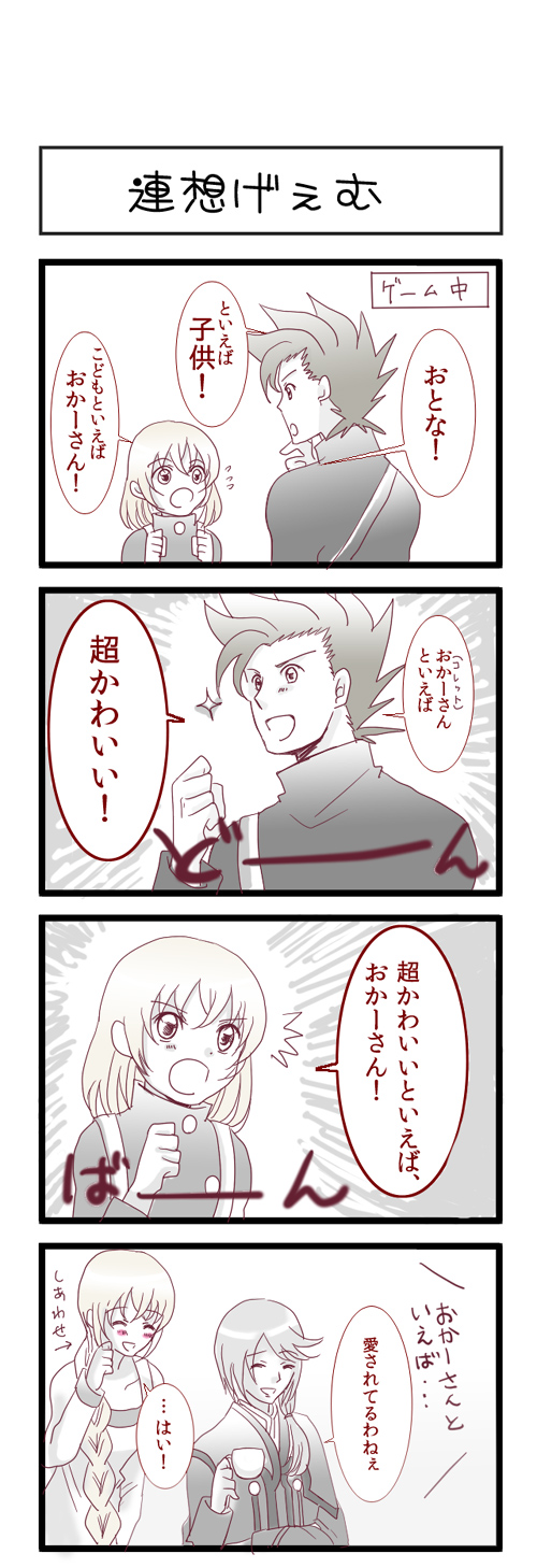 おかーさんは愛されてる! 因みにこれ、コレットと息子君だとおとーさん愛になるよ! ……ところで、先生をシリーズ本編漫画以来久々に描いた気がする……えっそんなまさか……!Σ(゚□゚; ご好意でヒースさんからこれと対になる嫁息子verをいただきました!→こちら top