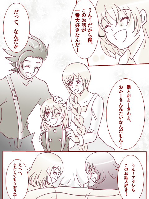←back 「おはなし聞かせて」 きっと息子君はそれとは知らず、両親のお話を聞いて育っているに違いない(`・ω・´) あと、こりんちゃんの髪下書き時点ではちゃんと結ばれてたのに、 ペン入れの時に無意識でおろしていたってどういうことなの……。