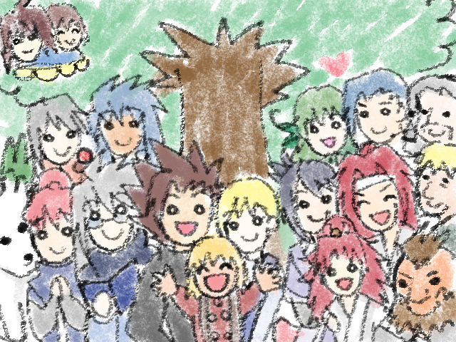 「ぼくと、だいすきなみんな」 ぼくと、おとーさんと、おかーさんと、だいすきなみんなをかきました。 まーてるさんは、ゆあんにてつだってもらったよ。 すごくこまかくおしえてもらって、なんかいもかきなおしました。 さいごにハートをかいたら、なにもいわなかったのでおこったのかな?っておもったんだけど おとーさんとおかーさんにきいたら、めずらしく「てれてた」らしいです。 出典: 『大樹の下で』