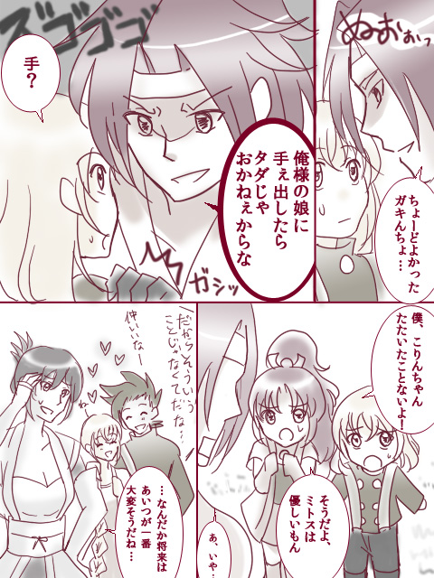 ←back リクエストいただいた、親同士の語り合い(子供達の将来について)ですが…… なんだかゼロスの娘バカ漫画になってしまった気が…… でもあれだけシスコンっぷりを発揮してれば、自分の娘に対してはもう過保護もいいとこになる気がします。 それに呆れつつも微笑むしいなさんであるといい! ロイコレ夫婦はお子さん二人を見ながら昔話に花を咲かせるといい!