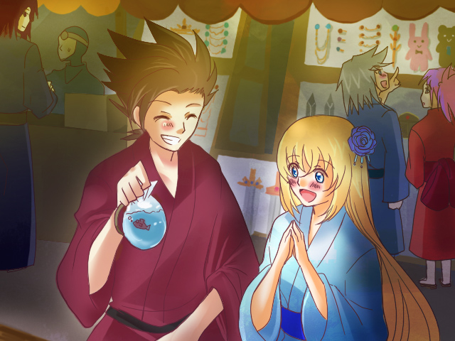 「ほら、一匹とれたぞー」 「わぁ〜ロイドすごーい!」 夏祭り、ご自由に想像を〜とお言葉いただけたので、妄想をヒートさせました(意味不明) いつもは背景?なにそれ美味しいの?なところを今回はがんばりました! 夏祭りっぽさが出てるといいんですが…… さりげに後ろのうさぎさんとくまさんが気に入っています(何故に)