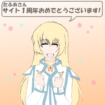 「七転八起」の蝸牛さんからいただいた一周年お祝いイラストですー!(>v<)v コレットちゃんかわいいよコレットちゃん!さすが蝸牛さん、私の嗜好をよんでいらっしゃる……! 淡い色使いが優しいコレットの雰囲気を表していていいですよね!(*´v`*) 蝸牛さんイラスト本当にありがとうございましたー!!