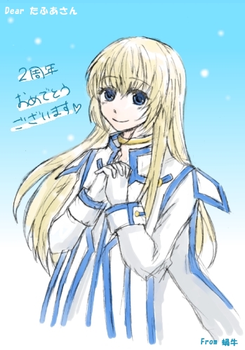 蝸牛さんから2周年記念のイラストをいただいてしまいました! かわいいよーかわいいコレットちゃんだよー(*´v`*) ブルーのイメージでまとまっている色調が涼やかな感じで素敵ですーv こんな笑みで微笑まれたらどんなお願いでも聞いてあげたくなっちゃいますね! 蝸牛さん素敵なイラストありがとうございました……!(*´v`*)