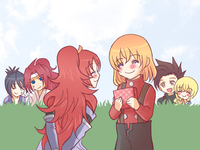 リクエスト内容 「まだ好きとか芽生えてなくて、幼なじみ的な感じでこりんちゃん→ミトス それを見守るロイコレとゼロしい」 毎年のバレンタイン恒例行事になっているに違いない!(覗き見が) ロイコレは微笑ましく見ていて、 ゼロしいはゼロスがむーっとなって、しいなさんがなだめてそうだ。 でもまだまだ、2人は幼馴染です!