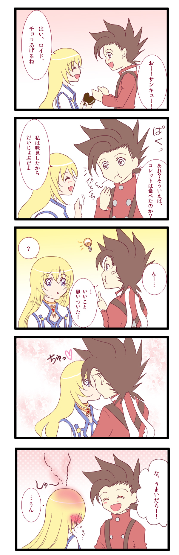 リクエスト内容 「ロイドがコレットにチョコを口移し 」 なんか……いつも通りのほのぼのになってしまいましたが……(汗) とりあえず、ロイド君は素でこんなことをしそうですYONE!