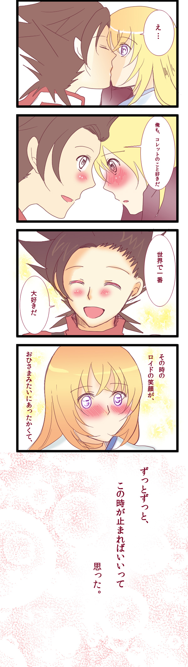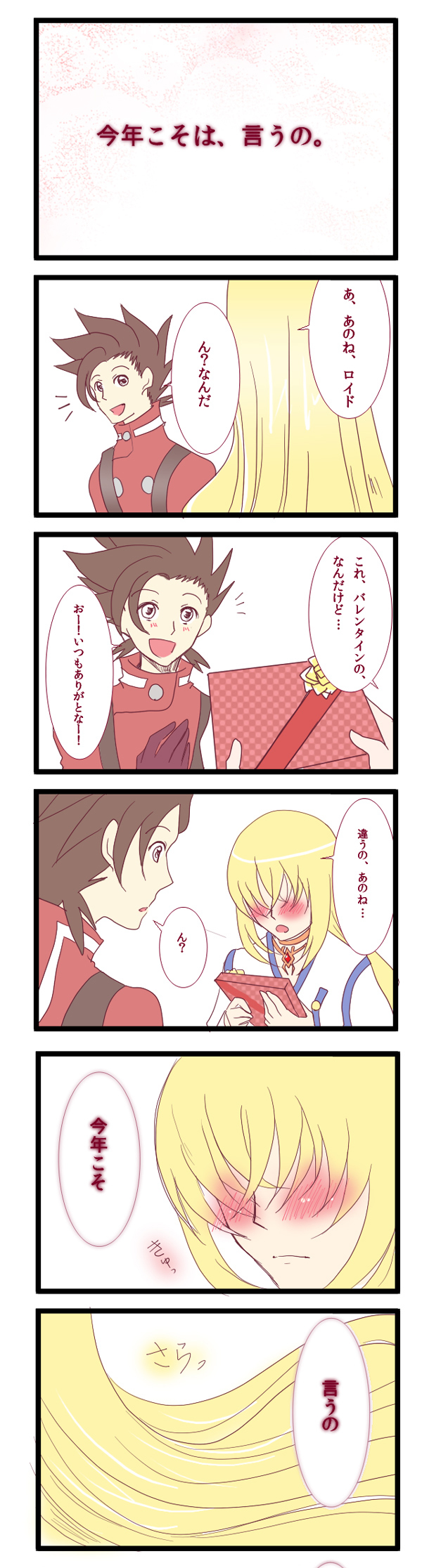 リクエスト内容 「チョコと一緒にキス(ほっぺでも口でもOK)をあげる、がんばるコレットちゃん ロイドくんもそれて嬉し恥ずかしで真っ赤になっててほしい」 ……今気づいたんですが、ロイド君真っ赤になるまでだったんですね! ……どうしようごく自然にナチュラルにコレットちゃんの唇をうばry や、まぁ……うん、ね! と、場を濁したところで、私的にいっぱいいっぱい少女漫画しましたということだけは、主張しておきます…。